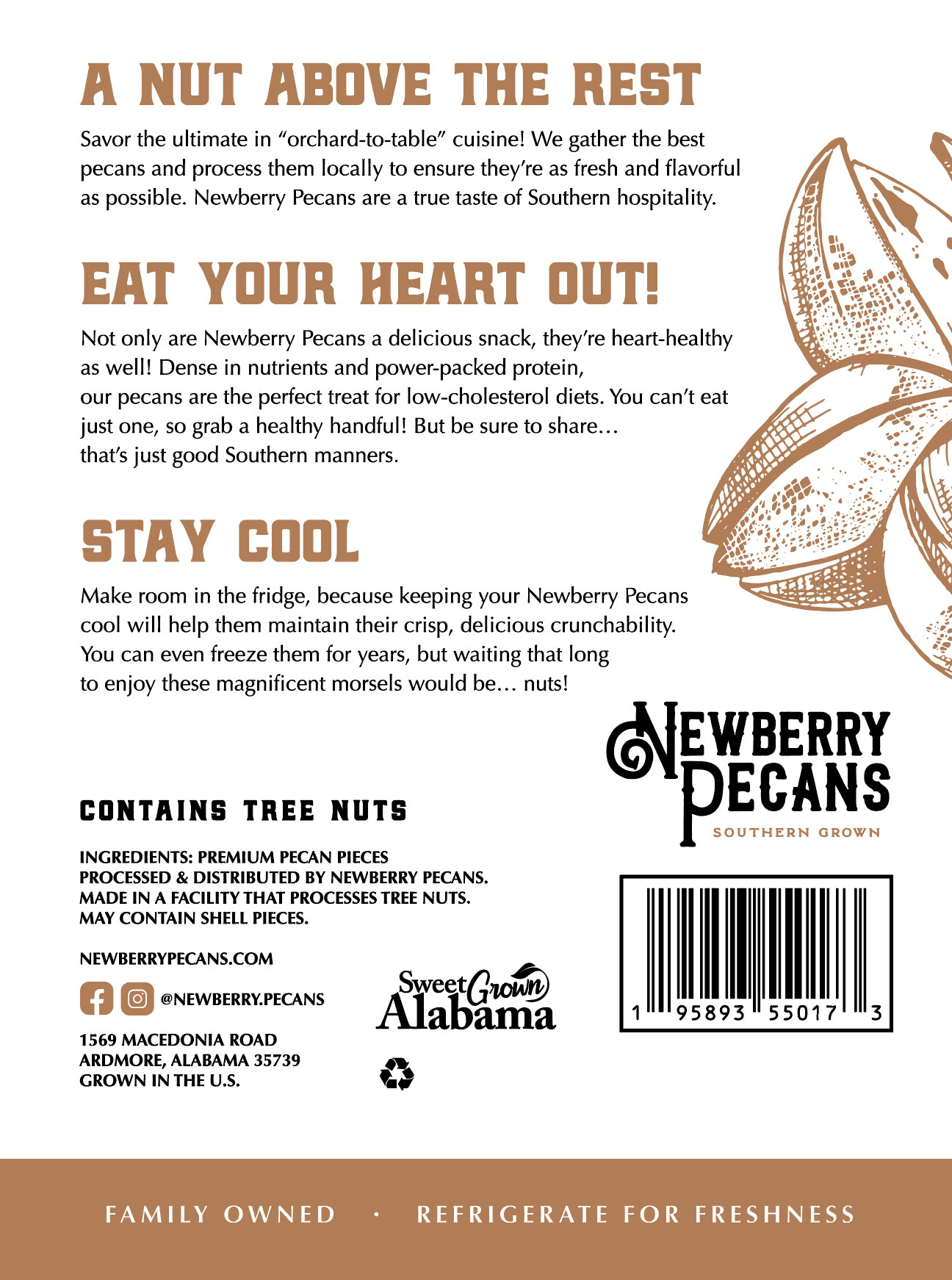 Savor the ultimate in “orchard-to-table” cuisine! We gather the best pecans and process them locally to ensure they're as fresh and flavorful as possible. Newberry Pecans are a true taste of Southern hospitality.